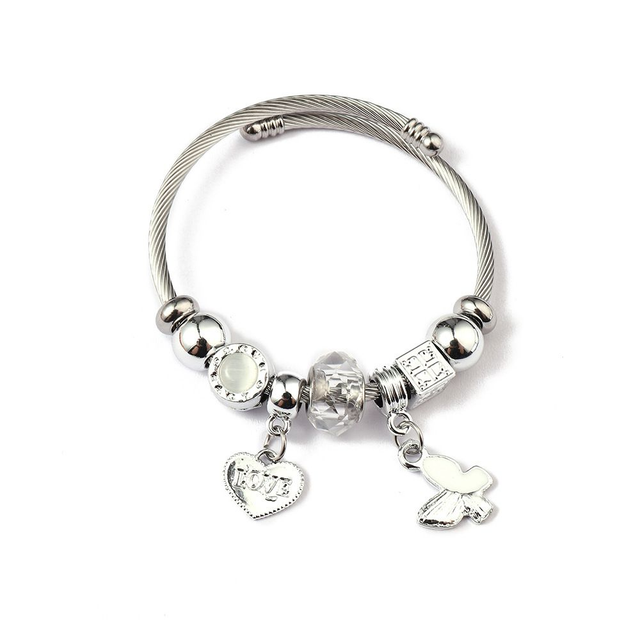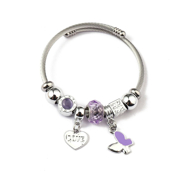 Bracelete em Aço Inox com Cristais Coloridos e Pendente de Borboleta e Coração "Love" - Ref. FP-62878
