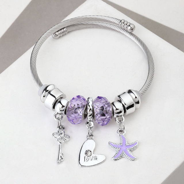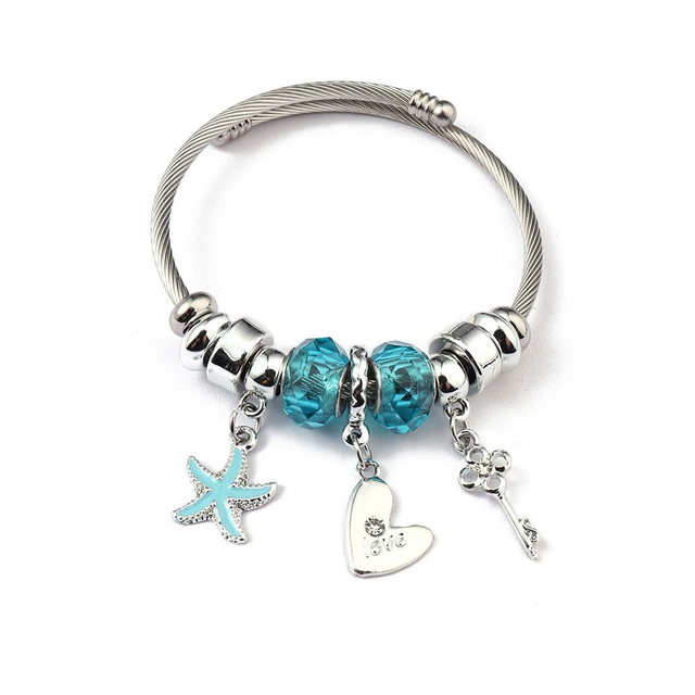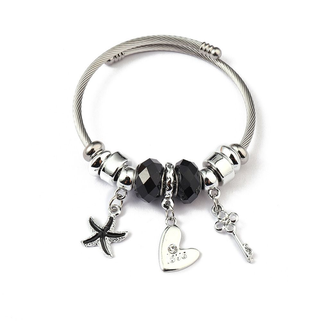 Esta pulseira em aço inoxidável de alta qualidade combina durabilidade com um design detalhado e feminino. Apresenta três pendentes simbólicos — uma Estrela do Mar, um Coração com a gravação "Love" e uma Chave — intercalados com contas de cristal facetado para um brilho sofisticado.
